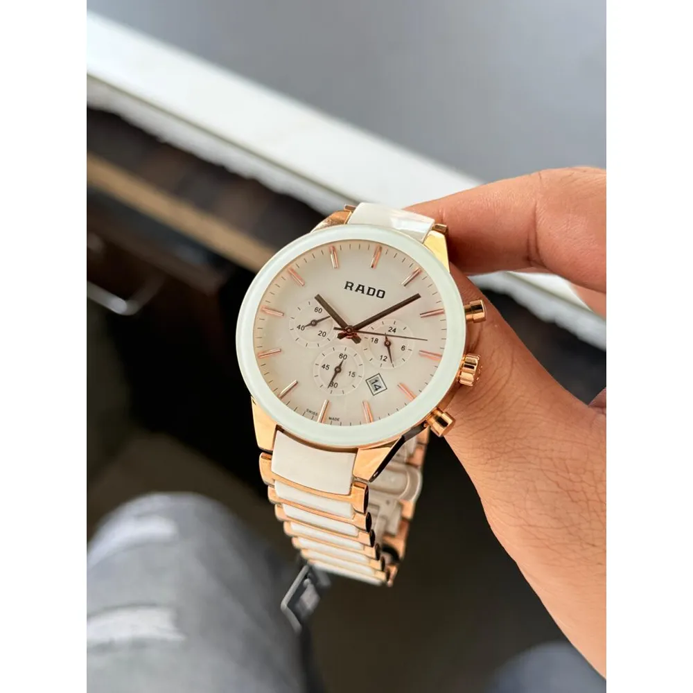 The Rado Centrix Chronograph is a bold and versatile timepiece crafted for those who appreciate a perfect blend of performance and style. Its striking 44mm dial paired with a premium white ceramic case gives the watch a sporty yet elegant appearance—ideal for both everyday wear and special occasions.